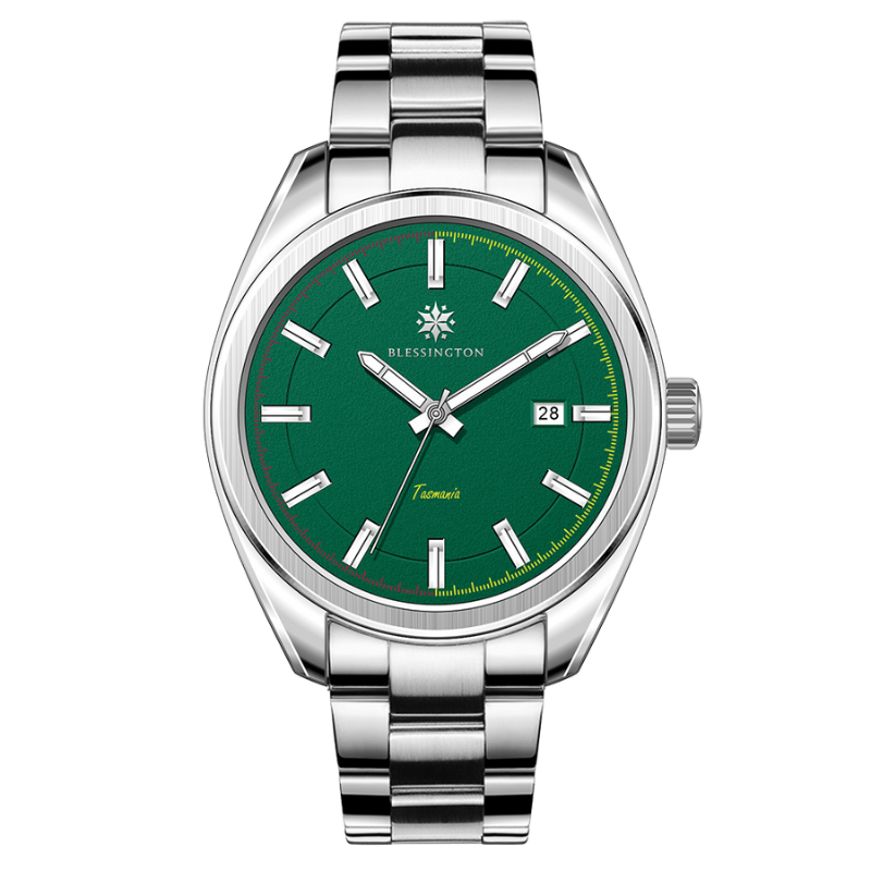 The dial is finished in a rich forest green, officially colour-matched to Tasmania’s recognised state colours by the Australian government. It’s a tone that speaks of wild terrain, misty ranges, and deep-rooted natural heritage. Quietly strong, just like the island itself.