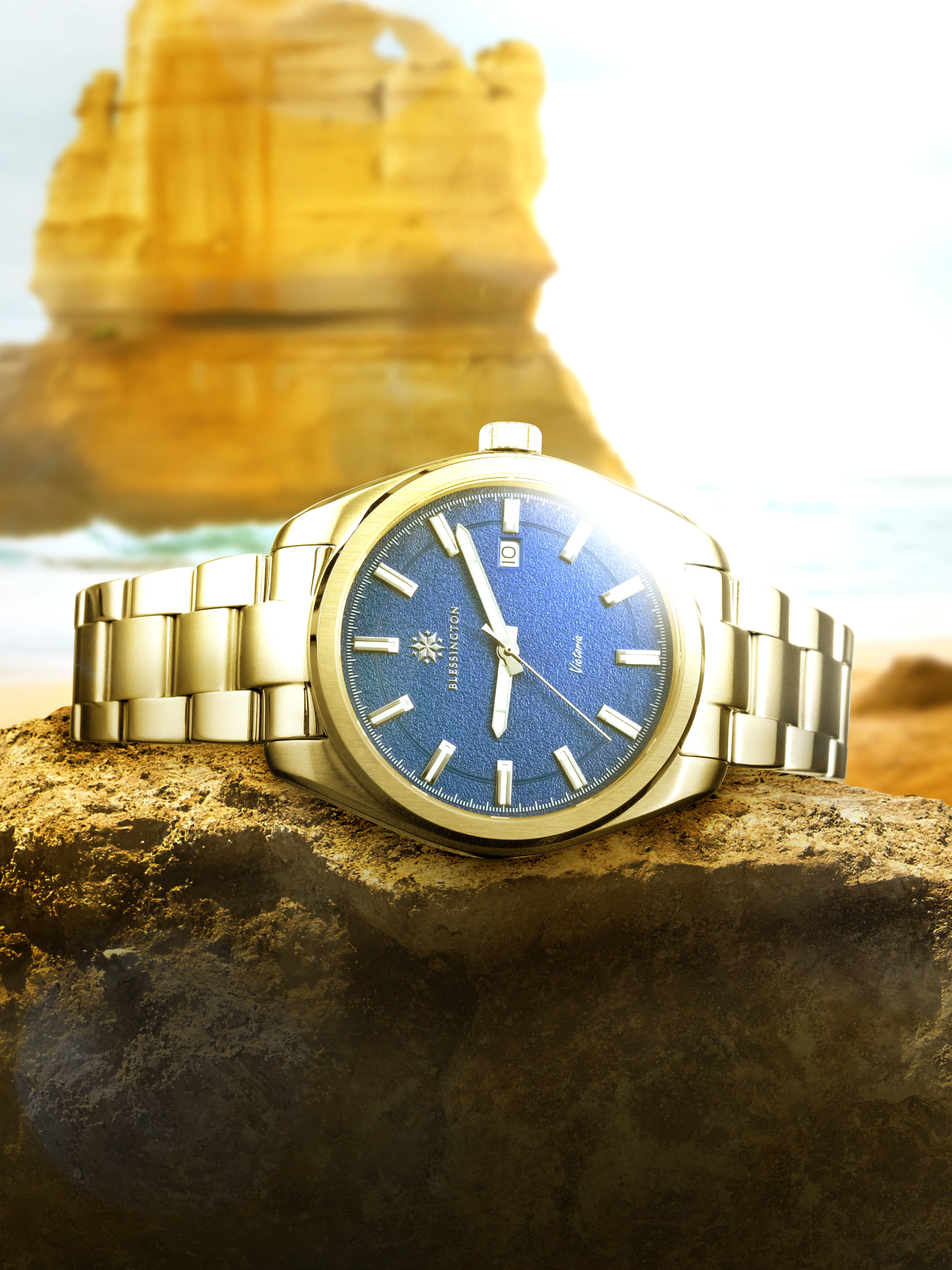 The dial features a deep navy blue, matched directly to Victoria’s official state colour as recognised by the Australian government. It’s a colour that feels familiar, whether you’re thinking of the state flag, a navy cap at the MCG, or the calm before a winter storm rolling across the bay.