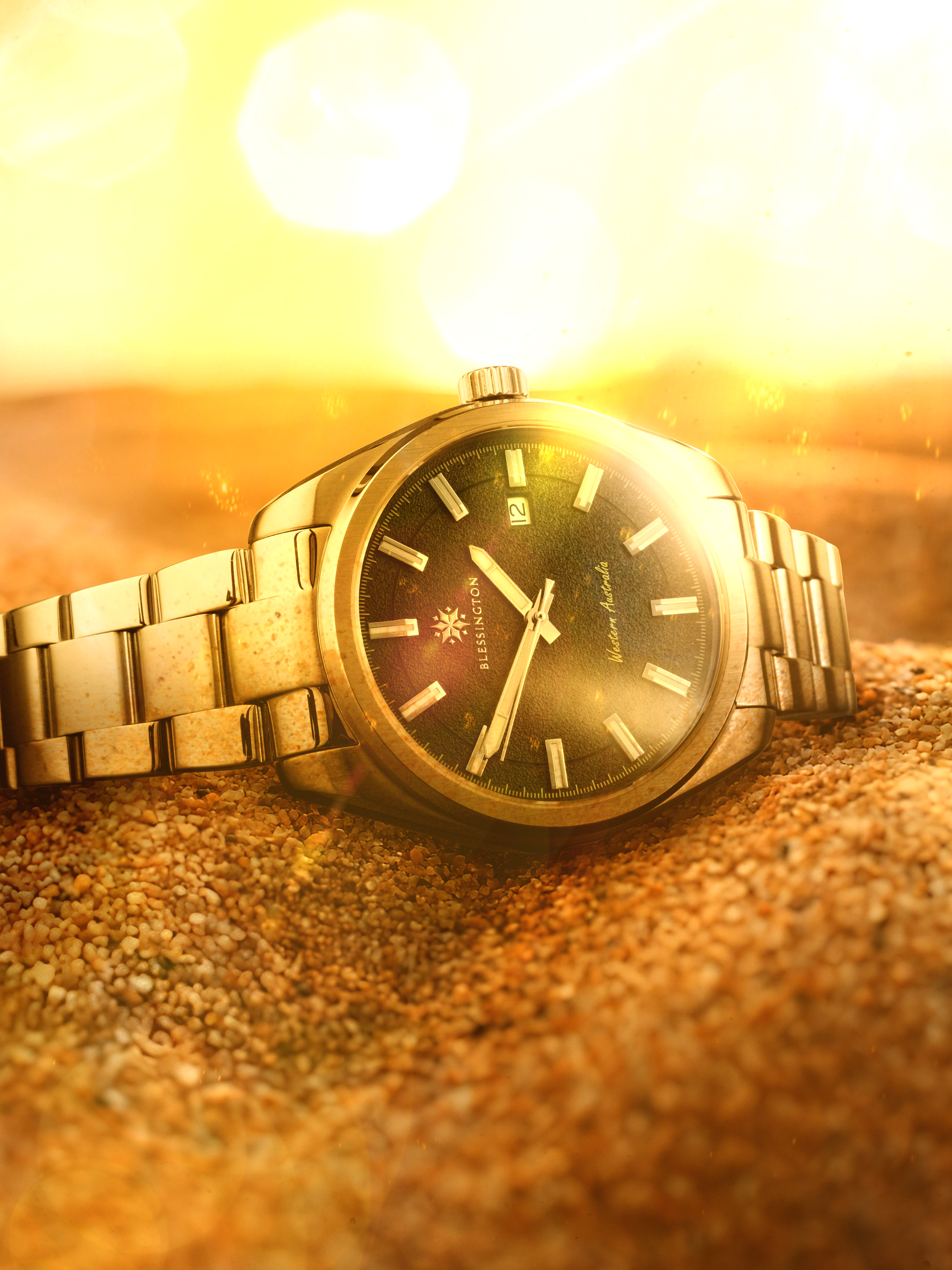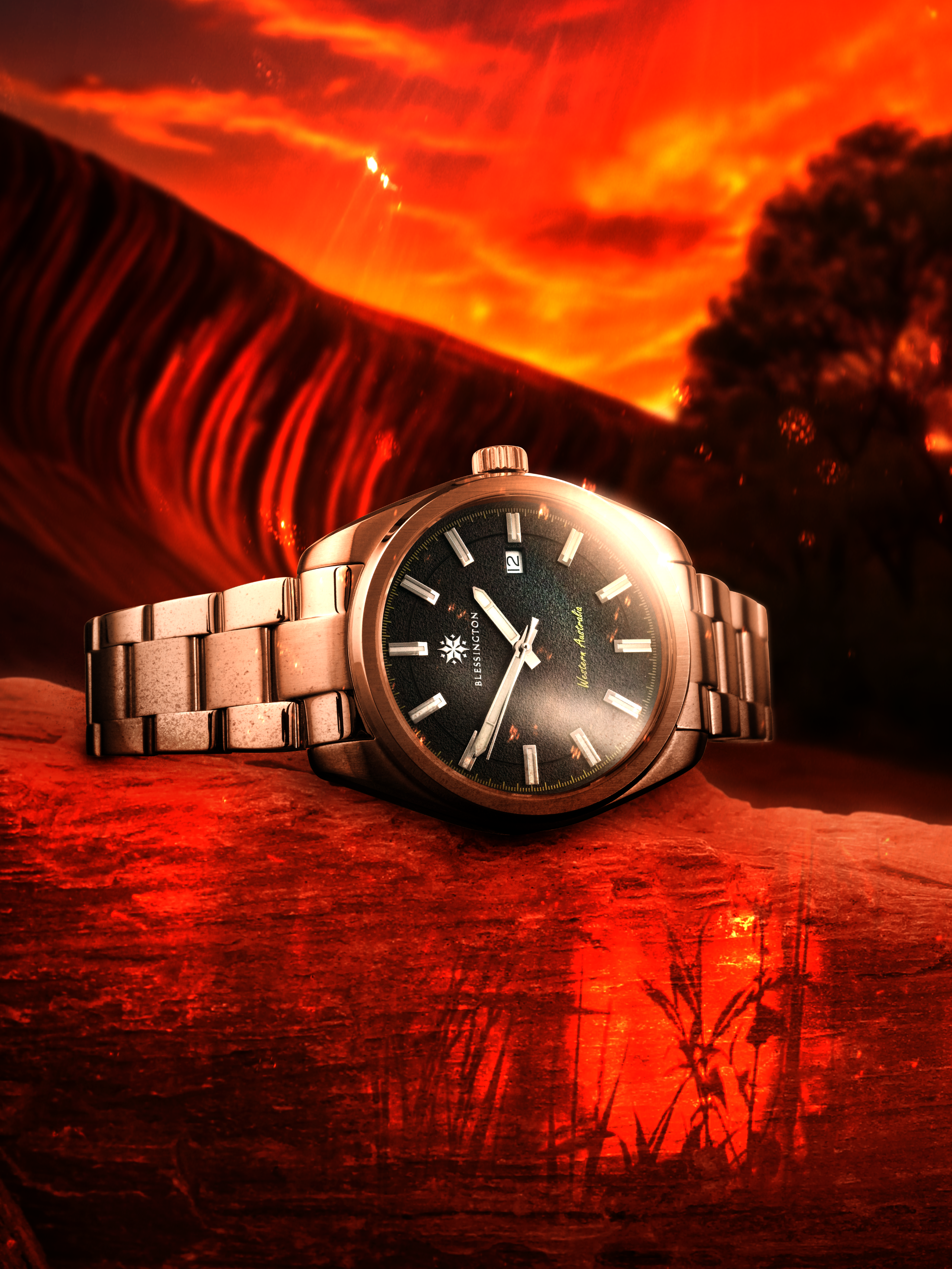 The dial is finished in a deep matte black, a striking reference to Western Australia’s state flag and its vast, sunburnt landscapes. From the black swan emblem to the endless night skies of the outback, this colour feels bold, grounded, and unmistakably WA.