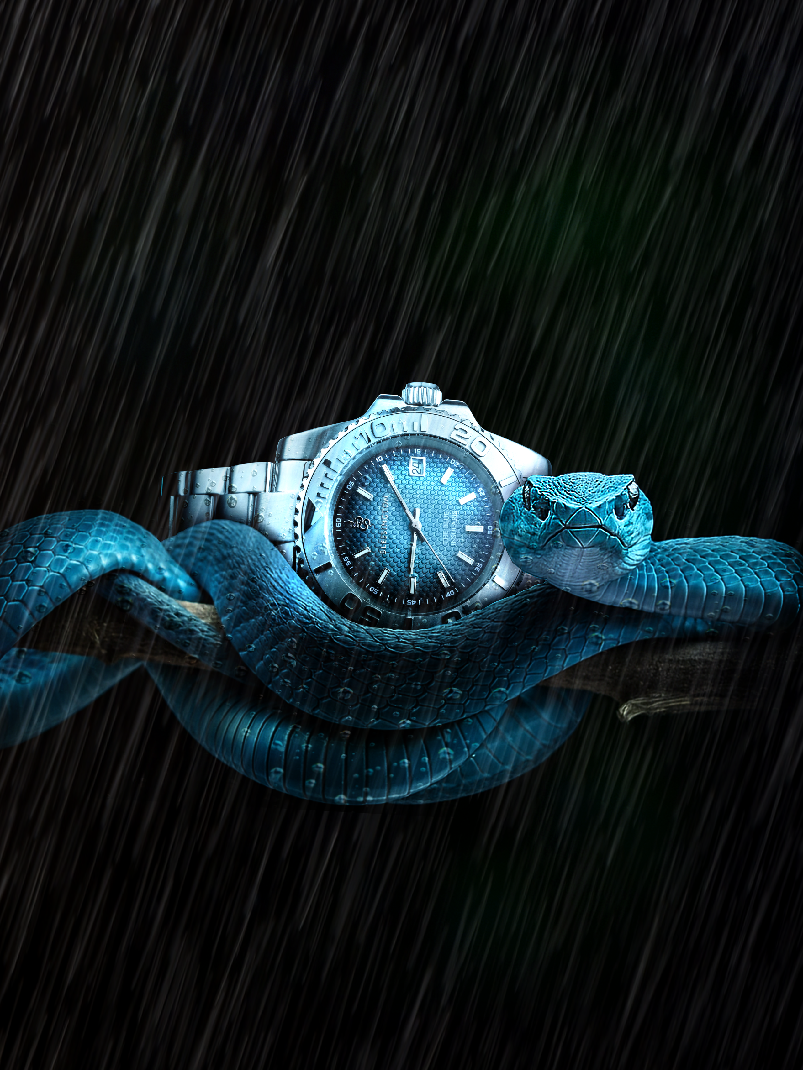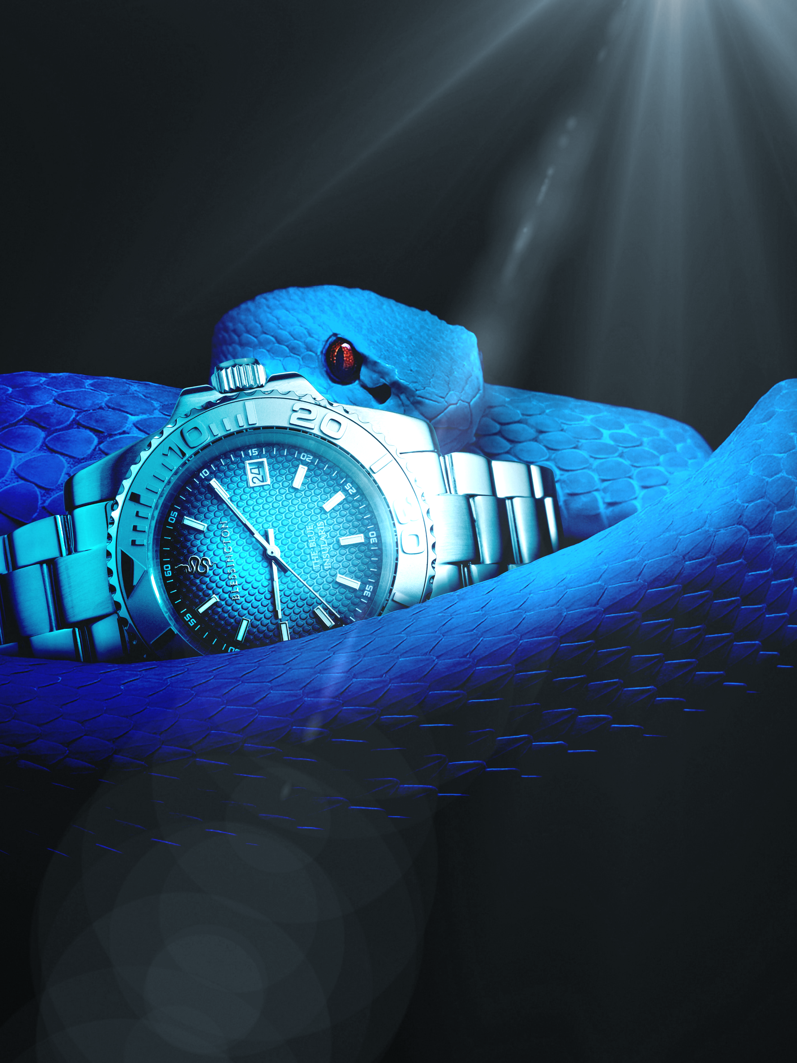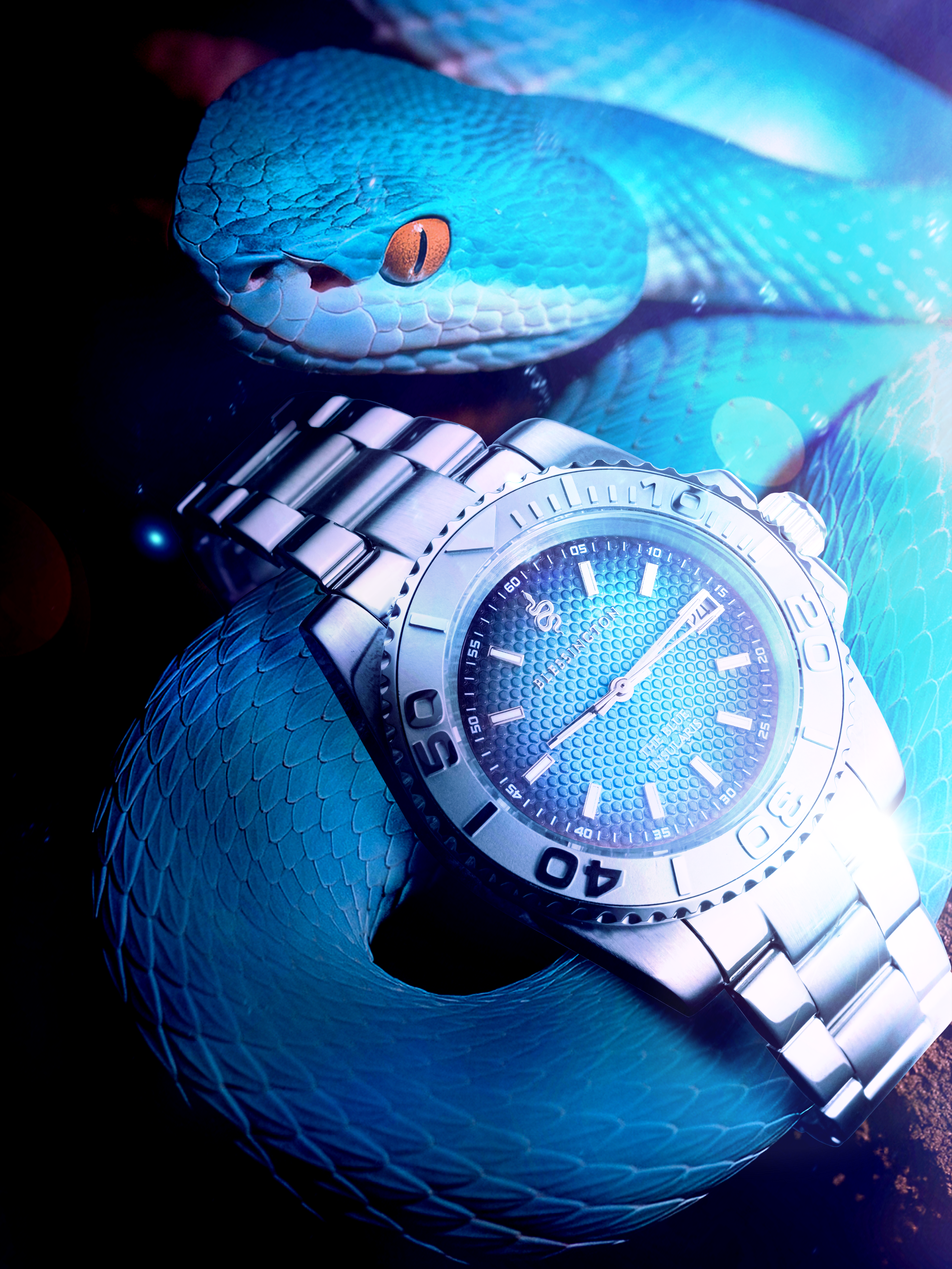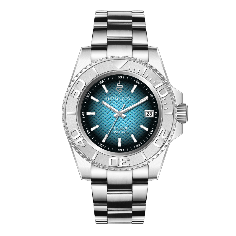 The dial of The Blue Insularis captures that same intensity. A vivid blue gradient radiates from the center, fading to black around the edges like a jungle shadow at dusk. A razor-sharp scale pattern ripples across the surface, giving the dial a sense of movement, alive with depth and texture under changing light.