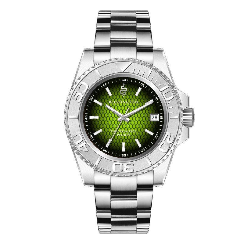 The dial of The Green Tree Python is a bold and striking homage. At first glance, your eye is drawn to the hypnotic gradient, an electric lime green radiating from the center and darkening toward the edges. Layered beneath is a vivid scale pattern, meticulously rendered to mimic the python’s smooth, overlapping skin. Each scale is three-dimensional, giving the dial a sense of texture and movement- as if the snake itself is coiled just beneath the crystal.