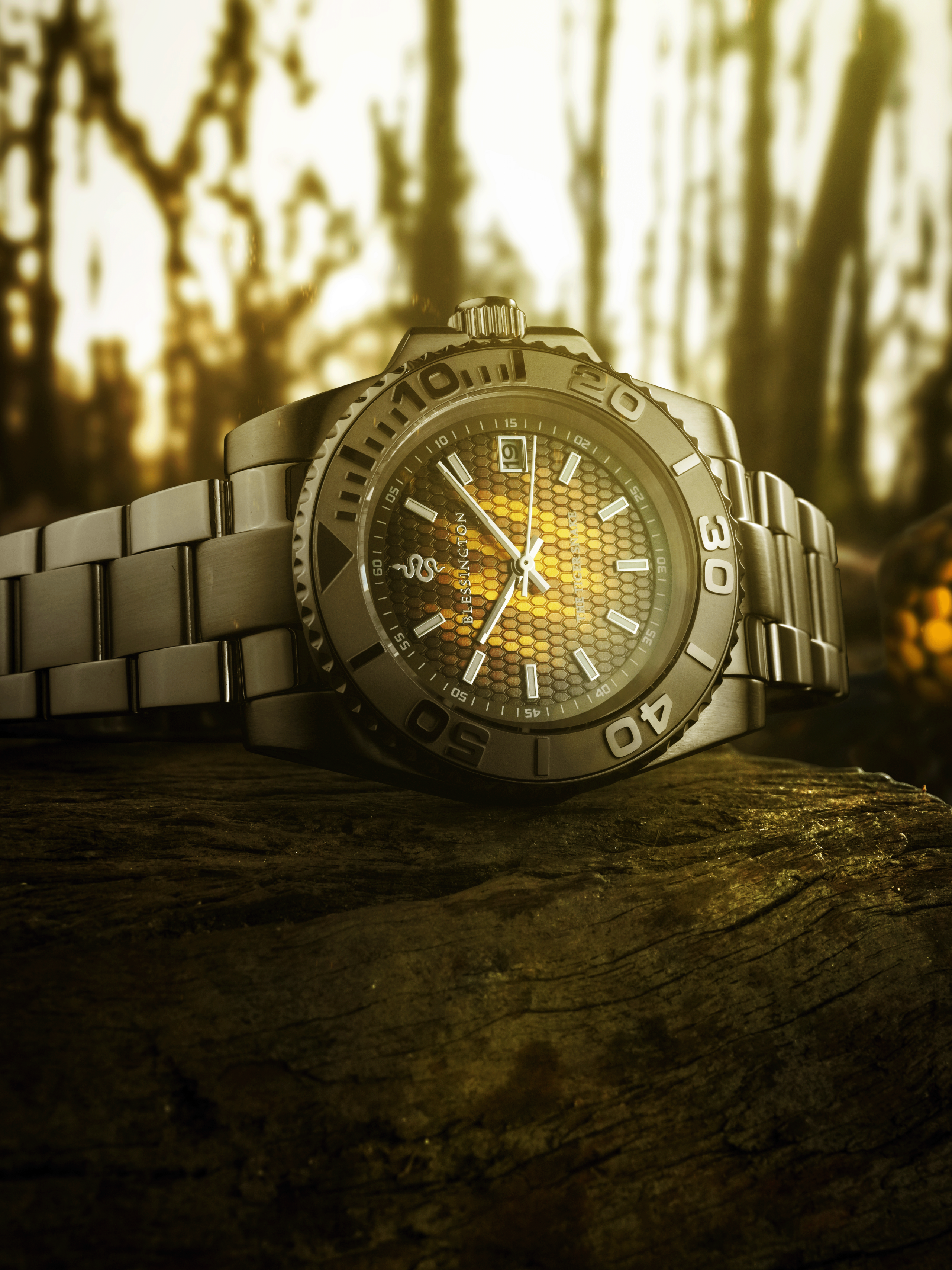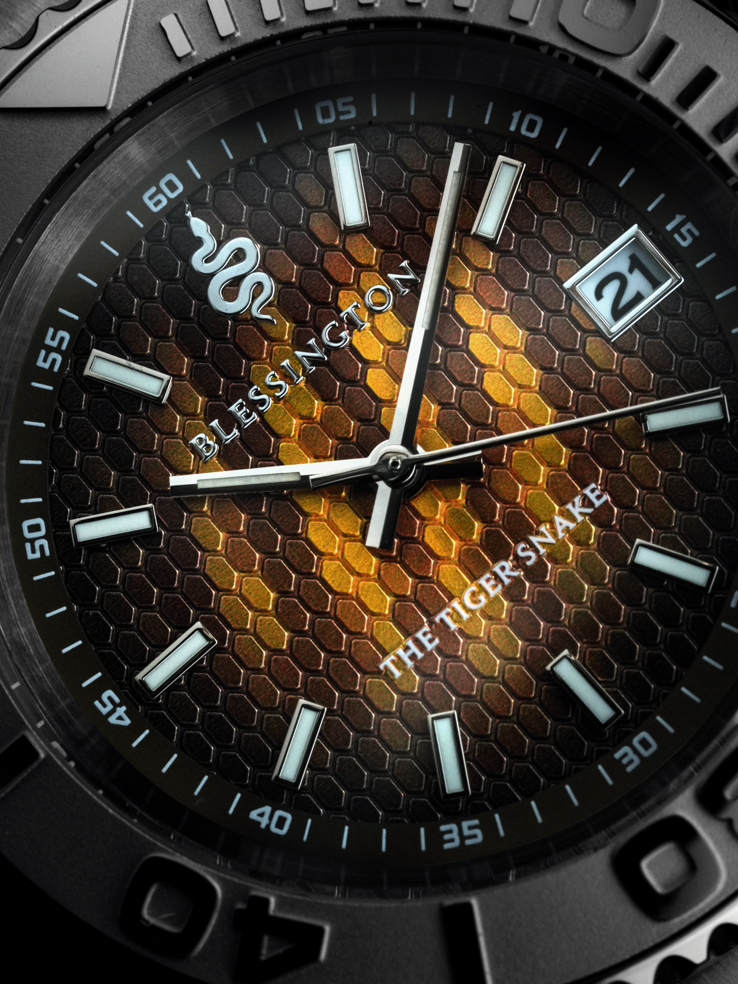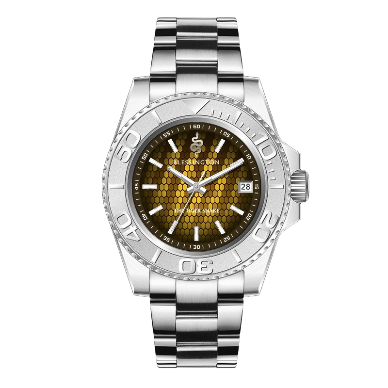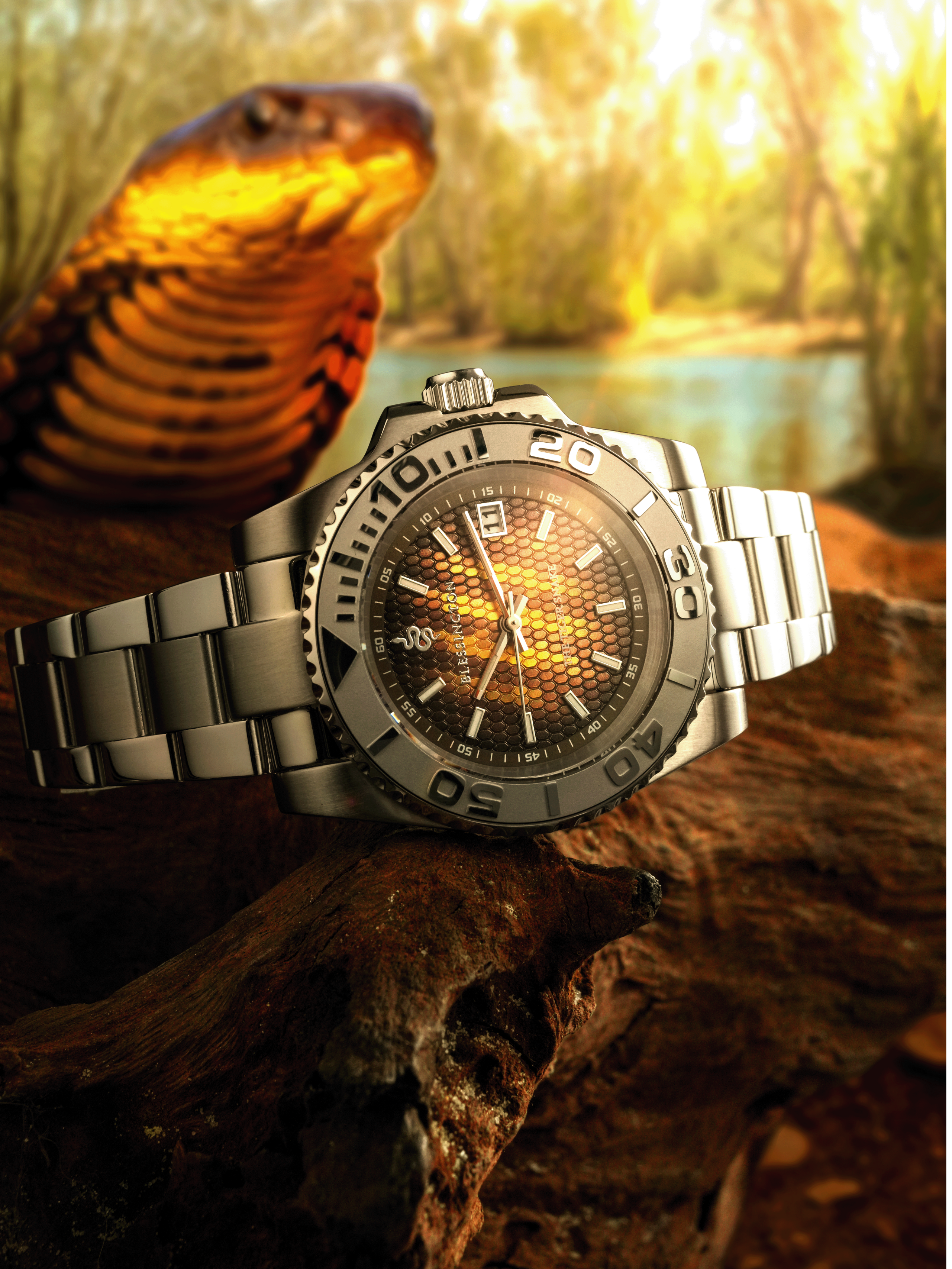 Venomous in presence yet refined in design, the Tiger Snake Watch captures the essence of one of Australia’s most striking predators. Its golden honeycomb dial shimmers with depth and detail, echoing the bold banded scales of the tiger snake itself.