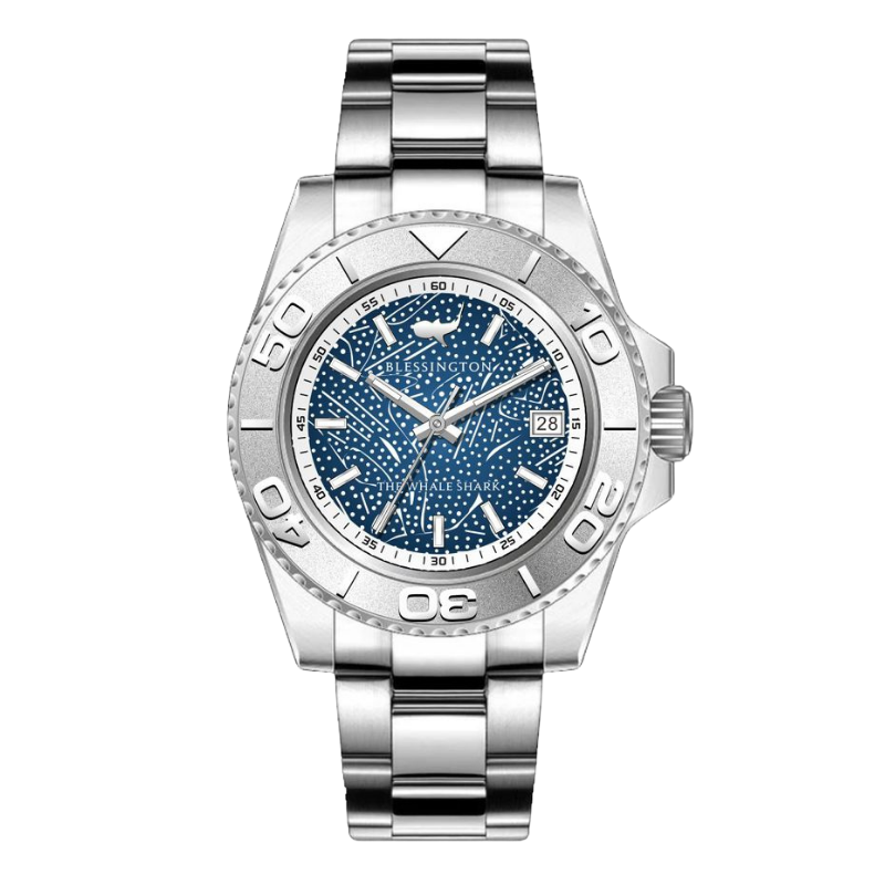 The dial of The Whale Shark watch is a breathtaking tribute to the ocean’s most majestic giant. It features a deep gradient of oceanic blue, darkening as it moves outward from the center, echoing the depth and mystery of open water. Across the dial, a constellation of soft white dots and flowing lines creates a beautiful illustration of The Whale Shark’s iconic pattern - each mark carefully placed to evoke both movement and awe.