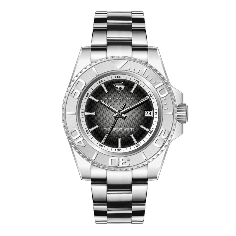 The dial of The Great White is a raw, commanding tribute to the apex predator. Clad in a deep gunmetal texture that mimics its sharkskin, the dial radiates toughness through its woven pattern capturing the resilience and grit of the Great White Shark's powerful form.